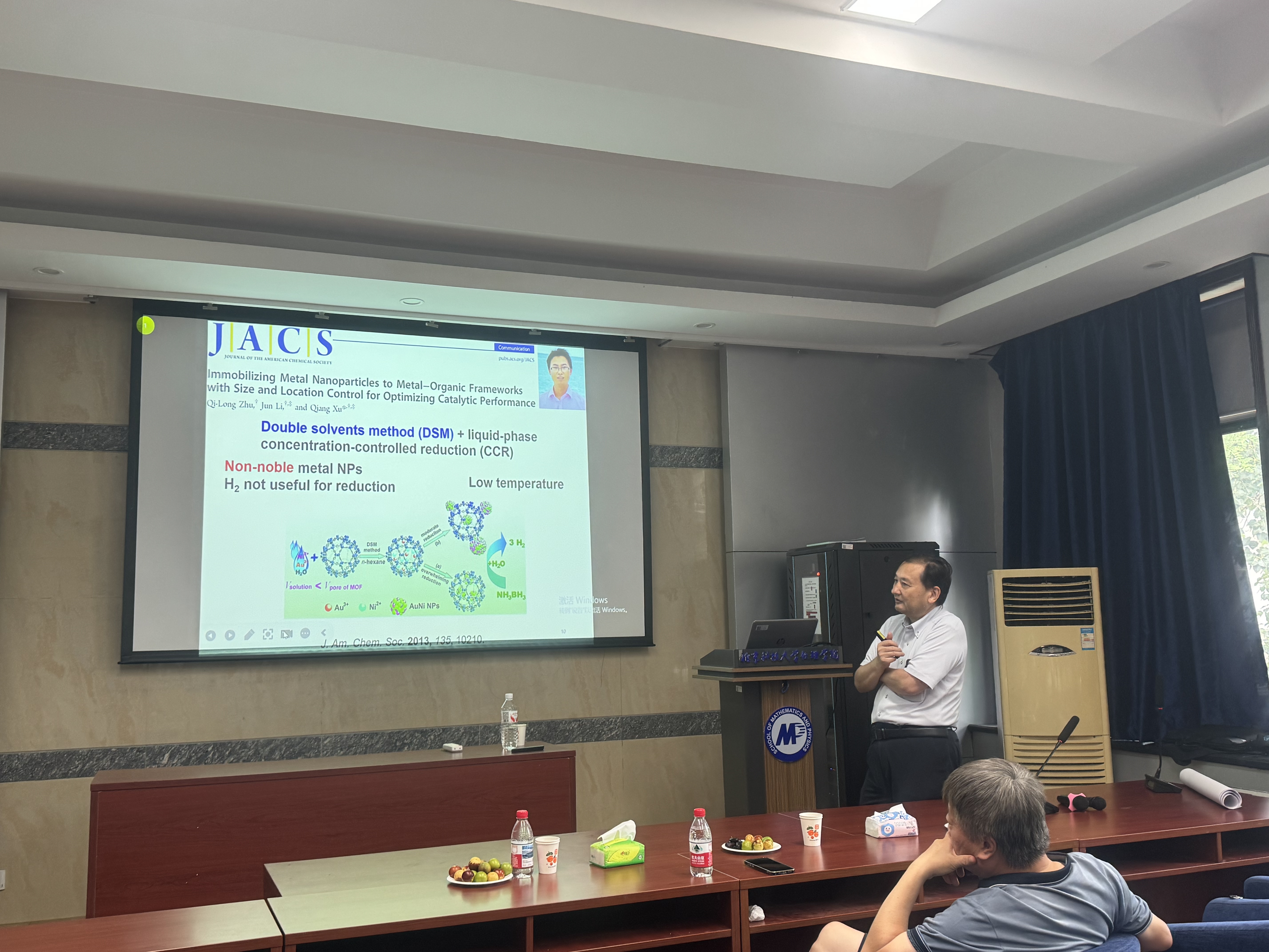 徐强教授以“金属有机框架(MOF)材料的催化与能源应用”为题为与会师生做学术报告。报告重点介绍了功能性MOFs复合纳米粒子、MOFs衍生材料和Quasi-MOFs的发展进程,并阐述了相关材料的制备、表征及应用,同时总结了该类材料的构效关系。报告中,徐强教授还重点讨论了MOFs材料在能源领域的应用潜力、近年前沿热点方向和科研工作细节,并分享了宝贵的科研经验。与会师生纷纷表示受益良多。